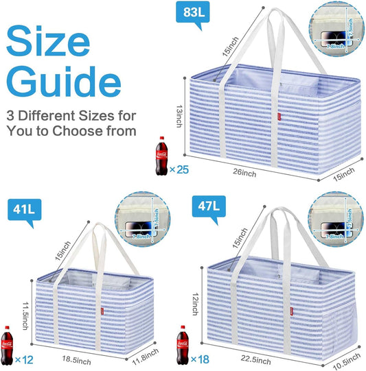 2 Pack Extra Large Utility Tote Bag with Metal Wire Frame and the Sides Rinforced, Extra Large Tote Bag with Handle, Reusable Grocery Bags Foldable, Beach Bag, Car Tote (Blue, 26''X15''X13'')